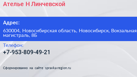 Ателье Н. Линчевской по адресу 630004, Новосибирская область, Новосибирск, Вокзальная магистраль, 8Б в дальнейшем Организация, размещена в следующих категориях: