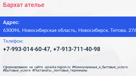 Бархат, ателье по адресу 630096, Новосибирская область, Новосибирск, Титова, 276 в дальнейшем Организация, размещена в следующих категориях: