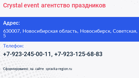Crystal event, агентство праздников по адресу 630007, Новосибирская область, Новосибирск, Советская, 5 в дальнейшем Организация, размещена в следующих категориях: