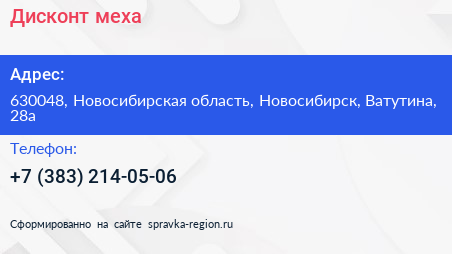 Дисконт & меха по адресу 630048, Новосибирская область, Новосибирск, Ватутина, 28а в дальнейшем Организация, размещена в следующих категориях: