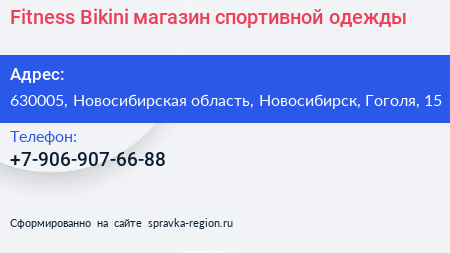 Fitness & Bikini, магазин спортивной одежды по адресу 630005, Новосибирская область, Новосибирск, Гоголя, 15 в дальнейшем Организация, размещена в следующих категориях: