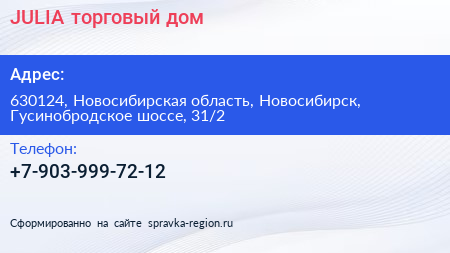 JULIA, торговый дом по адресу 630124, Новосибирская область, Новосибирск, Гусинобродское шоссе, 31/2 в дальнейшем Организация, размещена в следующих категориях: