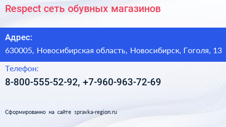 Respect, сеть обувных магазинов по адресу 630005, Новосибирская область, Новосибирск, Гоголя, 13 в дальнейшем Организация, размещена в следующих категориях: