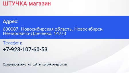 ШТУЧКА, магазин по адресу 630087, Новосибирская область, Новосибирск, Немировича-Данченко, 147/3 в дальнейшем Организация, размещена в следующих категориях: