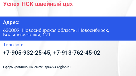 Успех-НСК, швейный цех по адресу 630009, Новосибирская область, Новосибирск, Большевистская, 121 в дальнейшем Организация, размещена в следующих категориях: