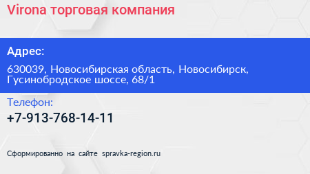 Virona, торговая компания по адресу 630039, Новосибирская область, Новосибирск, Гусинобродское шоссе, 68/1 в дальнейшем Организация, размещена в следующих категориях: