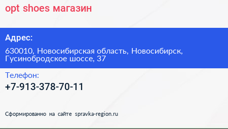 opt-shoes, магазин по адресу 630010, Новосибирская область, Новосибирск, Гусинобродское шоссе, 37 в дальнейшем Организация, размещена в следующих категориях:
