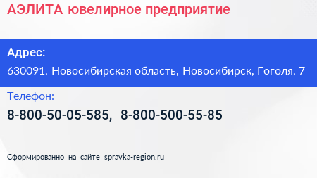 АЭЛИТА, ювелирное предприятие по адресу 630091, Новосибирская область, Новосибирск, Гоголя, 7 в дальнейшем Организация, размещена в следующих категориях: