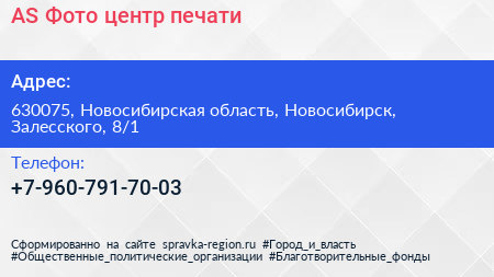 AS Фото, центр печати по адресу 630075, Новосибирская область, Новосибирск, Залесского, 8/1 в дальнейшем Организация, размещена в следующих категориях: