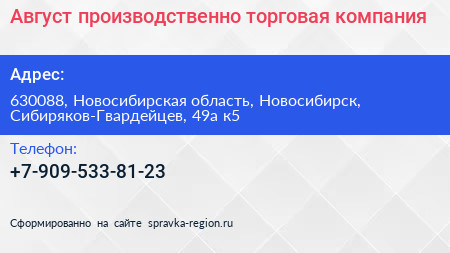 Август, производственно-торговая компания по адресу 630088, Новосибирская область, Новосибирск, Сибиряков-Гвардейцев, 49а к5 в дальнейшем Организация, размещена в следующих категориях: