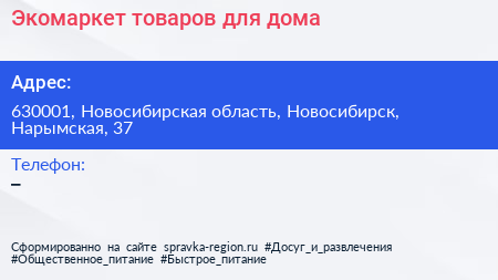 Экомаркет товаров для дома по адресу 630001, Новосибирская область, Новосибирск, Нарымская, 37 в дальнейшем Организация, размещена в следующих категориях: