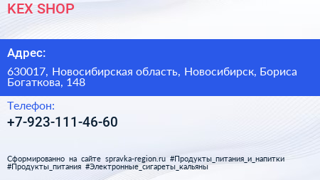 KEX-SHOP по адресу 630017, Новосибирская область, Новосибирск, Бориса Богаткова, 148 в дальнейшем Организация, размещена в следующих категориях: