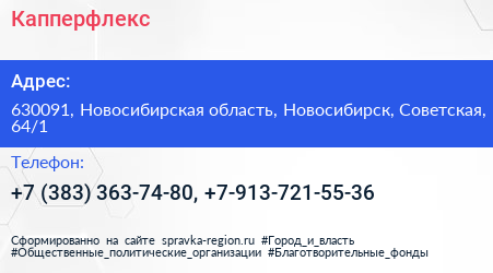 Капперфлекс по адресу 630091, Новосибирская область, Новосибирск, Советская, 64/1 в дальнейшем Организация, размещена в следующих категориях: