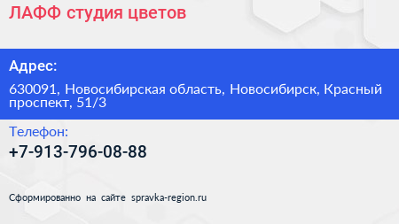 ЛАФФ, студия цветов по адресу 630091, Новосибирская область, Новосибирск, Красный проспект, 51/3 в дальнейшем Организация, размещена в следующих категориях: