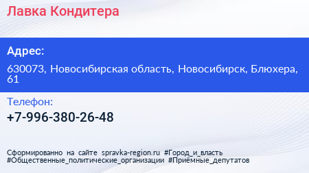 Лавка Кондитера по адресу 630073, Новосибирская область, Новосибирск, Блюхера, 61 в дальнейшем Организация, размещена в следующих категориях: