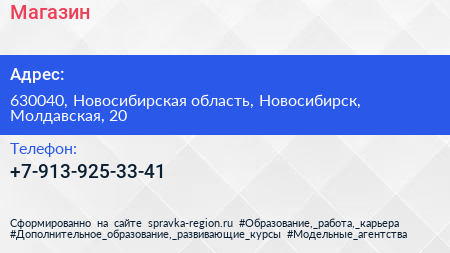 Магазин по адресу 630040, Новосибирская область, Новосибирск, Молдавская, 20 в дальнейшем Организация, размещена в следующих категориях: