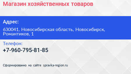 Магазин хозяйственных товаров по адресу 630041, Новосибирская область, Новосибирск, Романтиков, 1 в дальнейшем Организация, размещена в следующих категориях: