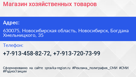 Магазин хозяйственных товаров по адресу 630075, Новосибирская область, Новосибирск, Богдана Хмельницкого, 35 в дальнейшем Организация, размещена в следующих категориях: