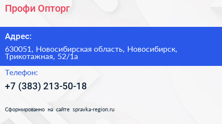 Профи Опторг по адресу 630051, Новосибирская область, Новосибирск, Трикотажная, 52/1а в дальнейшем Организация, размещена в следующих категориях: