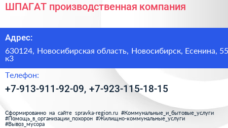 ШПАГАТ, производственная компания по адресу 630124, Новосибирская область, Новосибирск, Есенина, 55 к3 в дальнейшем Организация, размещена в следующих категориях: