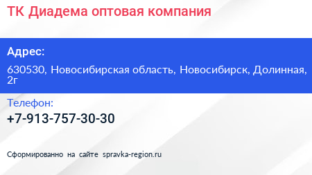 ТК Диадема, оптовая компания по адресу 630530, Новосибирская область, Новосибирск, Долинная, 2г в дальнейшем Организация, размещена в следующих категориях: