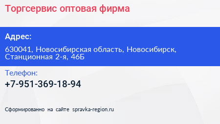 Торгсервис, оптовая фирма по адресу 630041, Новосибирская область, Новосибирск, Станционная 2-я, 46Б в дальнейшем Организация, размещена в следующих категориях: