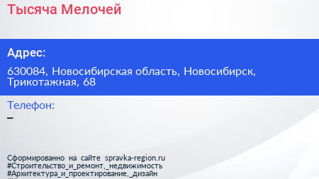 Тысяча Мелочей по адресу 630084, Новосибирская область, Новосибирск, Трикотажная, 68 в дальнейшем Организация, размещена в следующих категориях: