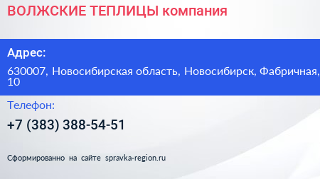 ВОЛЖСКИЕ ТЕПЛИЦЫ, компания по адресу 630007, Новосибирская область, Новосибирск, Фабричная, 10 в дальнейшем Организация, размещена в следующих категориях: