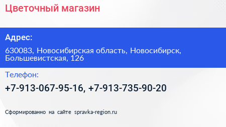 Цветочный магазин по адресу 630083, Новосибирская область, Новосибирск, Большевистская, 126 в дальнейшем Организация, размещена в следующих категориях: