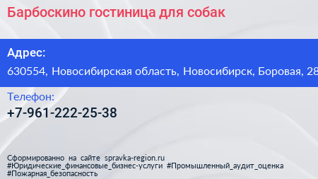 Барбоскино, гостиница для собак по адресу 630554, Новосибирская область, Новосибирск, Боровая, 28 в дальнейшем Организация, размещена в следующих категориях: