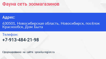 Фауна, сеть зоомагазинов по адресу 630501, Новосибирская область, Новосибирск, посёлок Краснообск, Дом Быта в дальнейшем Организация, размещена в следующих категориях: