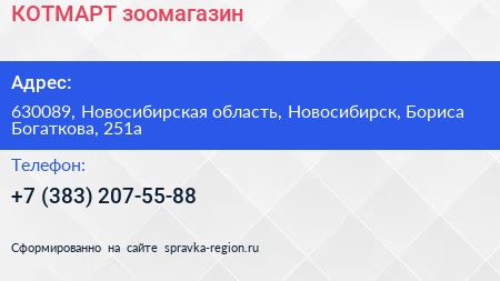КОТМАРТ, зоомагазин по адресу 630089, Новосибирская область, Новосибирск, Бориса Богаткова, 251а в дальнейшем Организация, размещена в следующих категориях: