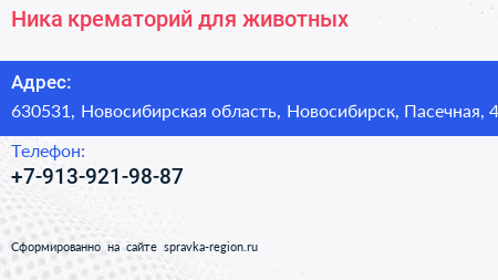 Ника, крематорий для животных по адресу 630531, Новосибирская область, Новосибирск, Пасечная, 4 в дальнейшем Организация, размещена в следующих категориях: