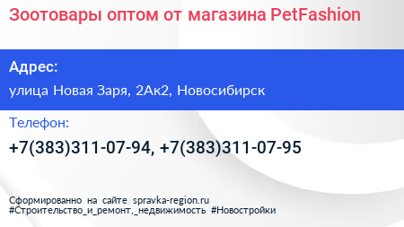 Зоотовары оптом от магазина "PetFashion" по адресу улица Новая Заря, 2Ак2, Новосибирск в дальнейшем Организация, размещена в следующих категориях: