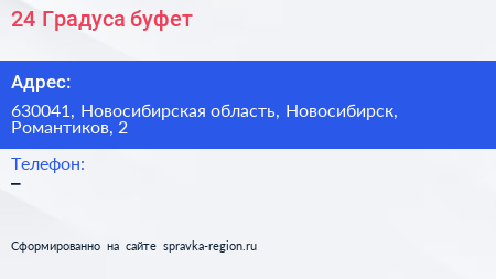 24 Градуса, буфет по адресу 630041, Новосибирская область, Новосибирск, Романтиков, 2 в дальнейшем Организация, размещена в следующих категориях: