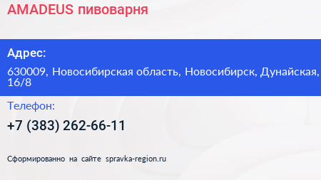AMADEUS, пивоварня по адресу 630009, Новосибирская область, Новосибирск, Дунайская, 16/8 в дальнейшем Организация, размещена в следующих категориях: