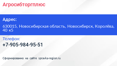 Агросибторгплюс по адресу 630015, Новосибирская область, Новосибирск, Королёва, 40 к5 в дальнейшем Организация, размещена в следующих категориях: