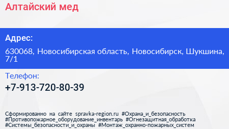 Алтайский мед по адресу 630068, Новосибирская область, Новосибирск, Шукшина, 7/1 в дальнейшем Организация, размещена в следующих категориях:
