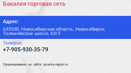 Бакалея, торговая сеть по адресу 633100, Новосибирская область, Новосибирск, Толмачёвское шоссе, 63/3 в дальнейшем Организация, размещена в следующих категориях: