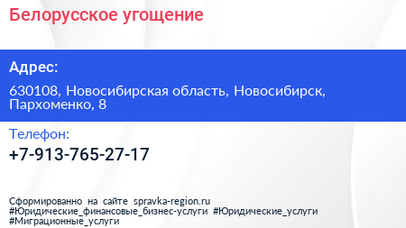 Белорусское угощение по адресу 630108, Новосибирская область, Новосибирск, Пархоменко, 8 в дальнейшем Организация, размещена в следующих категориях: