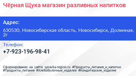 Чёрная Щука, магазин разливных напитков по адресу 630530, Новосибирская область, Новосибирск, Долинная, 2г в дальнейшем Организация, размещена в следующих категориях: