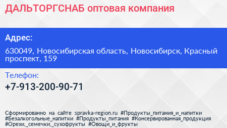 ДАЛЬТОРГСНАБ, оптовая компания по адресу 630049, Новосибирская область, Новосибирск, Красный проспект, 159 в дальнейшем Организация, размещена в следующих категориях: