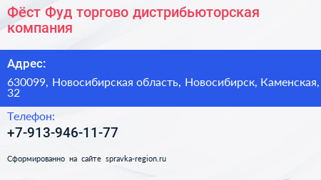Фёст Фуд, торгово-дистрибьюторская компания по адресу 630099, Новосибирская область, Новосибирск, Каменская, 32 в дальнейшем Организация, размещена в следующих категориях: