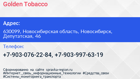 Golden Tobacco по адресу 630099, Новосибирская область, Новосибирск, Депутатская, 46 в дальнейшем Организация, размещена в следующих категориях: