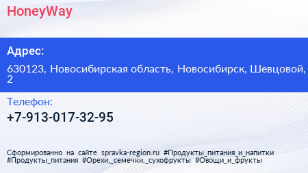 HoneyWay по адресу 630123, Новосибирская область, Новосибирск, Шевцовой, 2 в дальнейшем Организация, размещена в следующих категориях: