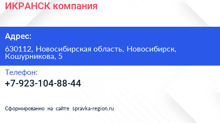 ИКРАНСК, компания по адресу 630112, Новосибирская область, Новосибирск, Кошурникова, 5 в дальнейшем Организация, размещена в следующих категориях: