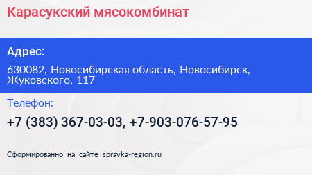 Карасукский мясокомбинат по адресу 630082, Новосибирская область, Новосибирск, Жуковского, 117 в дальнейшем Организация, размещена в следующих категориях: