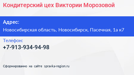 Кондитерский цех Виктории Морозовой по адресу Новосибирская область, Новосибирск, Пасечная, 1а к7 в дальнейшем Организация, размещена в следующих категориях:
