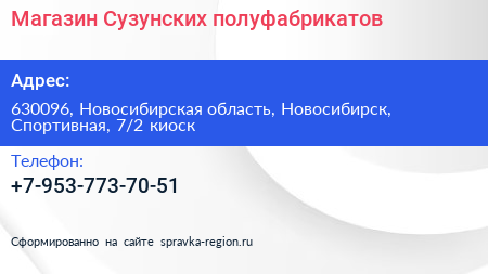Магазин Сузунских полуфабрикатов по адресу 630096, Новосибирская область, Новосибирск, Спортивная, 7/2 киоск в дальнейшем Организация, размещена в следующих категориях: