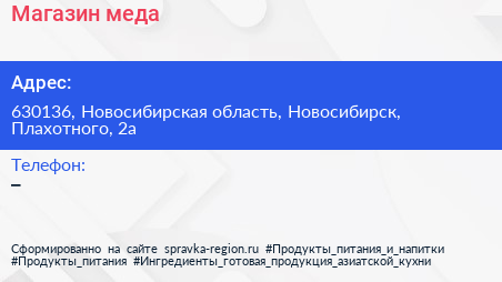 Магазин меда по адресу 630136, Новосибирская область, Новосибирск, Плахотного, 2а в дальнейшем Организация, размещена в следующих категориях: